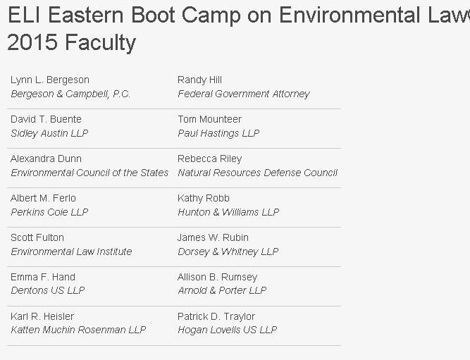 ELI’s Eastern Boot Camp on Environmental Law® is led by carefully selected senior practitioners and environmental managers who provide a practical and pragmatic view of environmental law and policy issues likely to be encountered by those working in the field. Annual topics include sessions on: NEPA, ESA, CWA, civil and criminal enforcement, TSCA, FIFRA, energy law, CAA, RCRA, CERCLA, due diligence in transactions, and ethics.