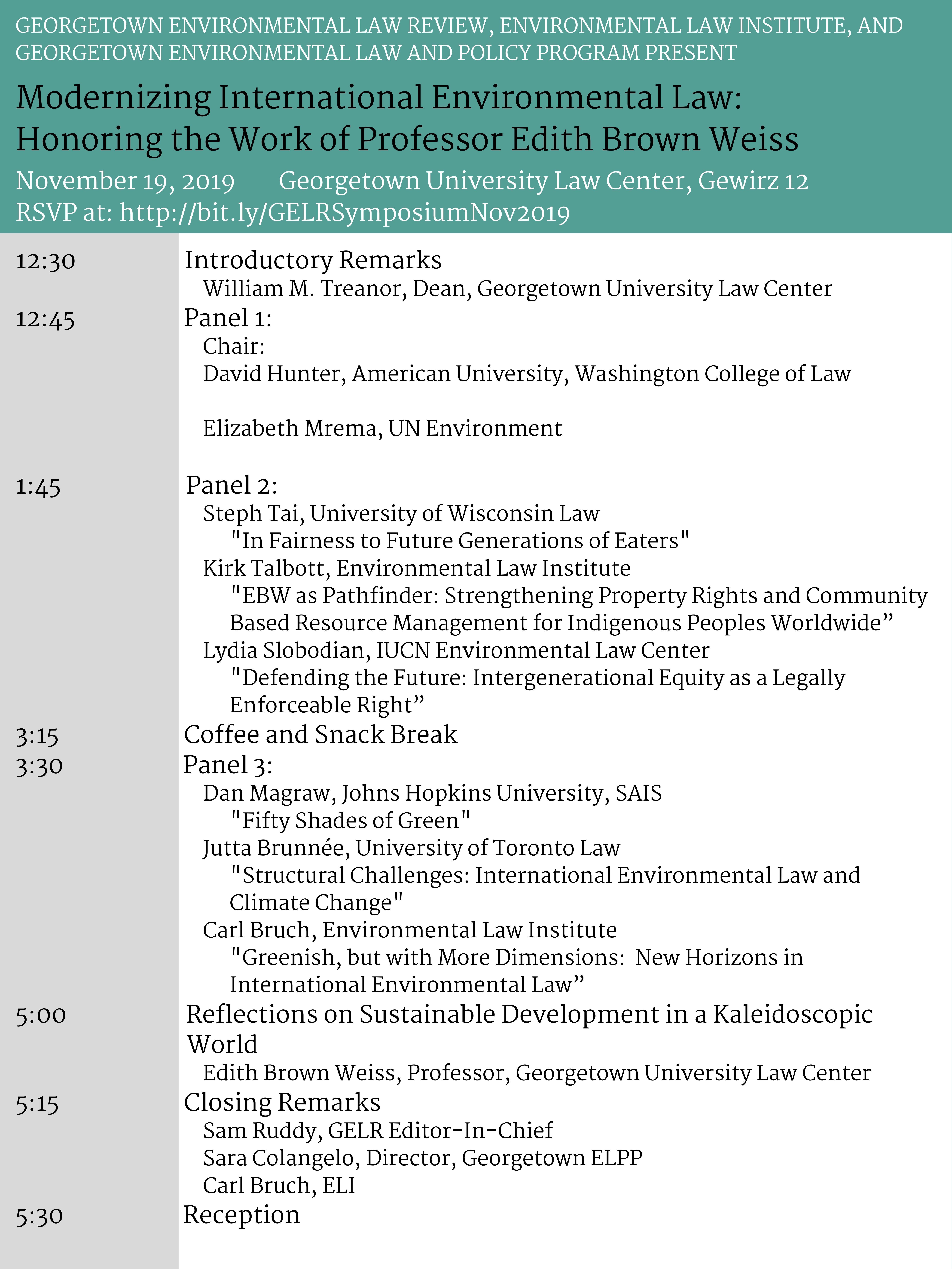 The Georgetown Environmental Law Review invited participants to their biannual symposium on November 19, 2019. This symposium explored and built upon Professor Brown Weiss’s academic and professional work in international environmental law with panels on intergenerational equity, accountability and compliance, and international legal structures.