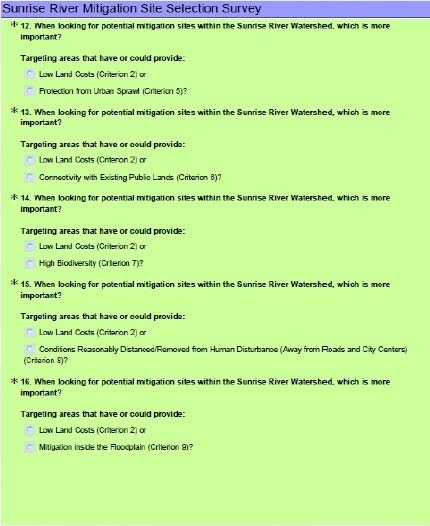 3. | Following the workshops, stakeholders completed a web-based survey in which they ranked selected criteria against one another in a series of pairwise comparisons (see below). Survey results were used to assess the overall importance of each criterion to the group as a whole using the Analytic Hierarchy Process (AHP), a type of Multi-Criteria Decision Analysis (MCDA). These importance ratings were then used to determine the weightings to use for each criterion as part of the Spatial Decision Support System (SDSS) model. MCDA methods such as AHP provide a transparent, structured decisionmaking process for identifying stakeholder preferences based on complex, disparate, and conflicting preference data.6 The survey was completed online, rather than as a group, to minimize bias and avoid concerns related to group think. |