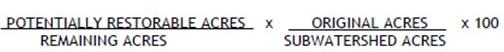 The Wisconsin Department of Natural Resources (WDNR) Potential Opportunity Tool:10 This tool evaluates the opportunity for wetland functional improvement through restoration across HUC-12 watersheds as indicated by the relative amount of Potentially Restorable Wetlands (PRWs) and the original percentage of wetlands in the watershed. WDNR assesses potential opportunities using the equation below.