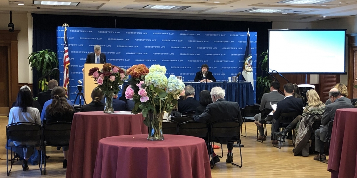 On the bright, late autumn afternoon of November 19, over 100 people gathered at Georgetown University Law Center for a half-day forum on “Modernizing International Environmental Law” in celebration of Prof. Edith Brown Weiss. Co-sponsored by the Environmental Law Institute, the Georgetown Environmental Law Review, and the Georgetown Environmental Law and Policy Program, the symposium was more than a tribute to a famous scholar and beloved teacher. The presentations, panels, video calls, lively discussions, and reception portrayed a pathfinder with a strong moral compass and deep conviction—such that all of us felt inspired and motivated to continue in her footsteps.
