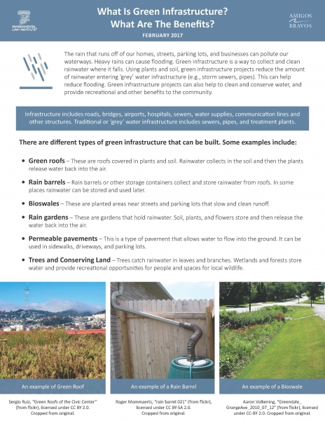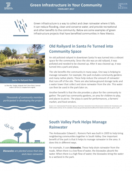 Green infrastructure is a way to collect and clean rainwater where it falls. It can reduce flooding, clean and conserve water, and provide recreational and other benefits to communities. ELI has partnered with Amigos Bravos to produce several short fact sheets about green infrastructure.